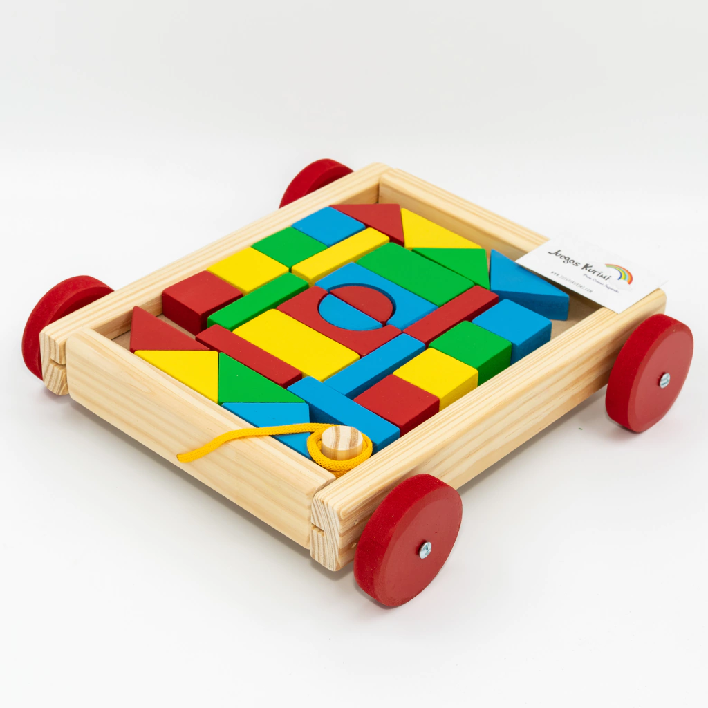 Contiene: Carro de arrastre con 28 bloques de distintas formas y colores.
