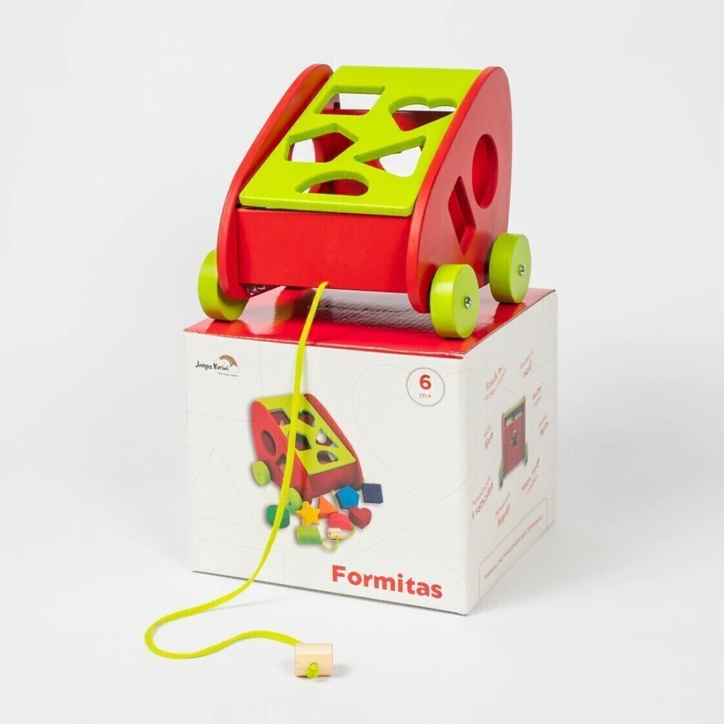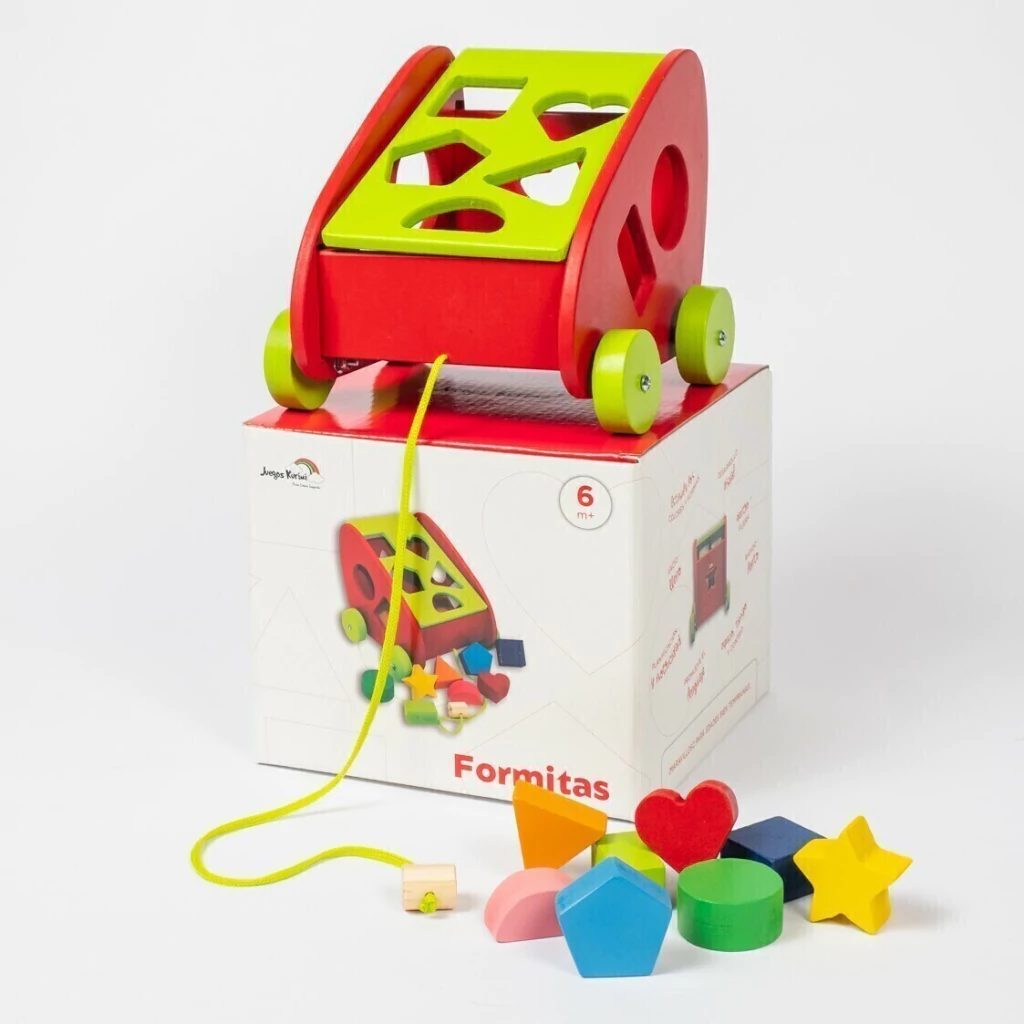Contiene: Carro de arrastre con 8 figuras para ensartar, tapa movible y soga para arrastrar.