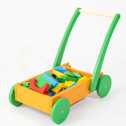 Contiene: 40 bloques gigantes de varios colores y figuras, un carrito de madera con ruedas y manubrio.