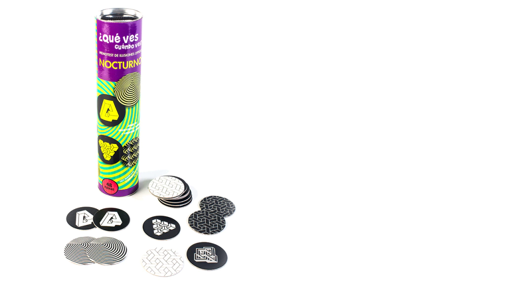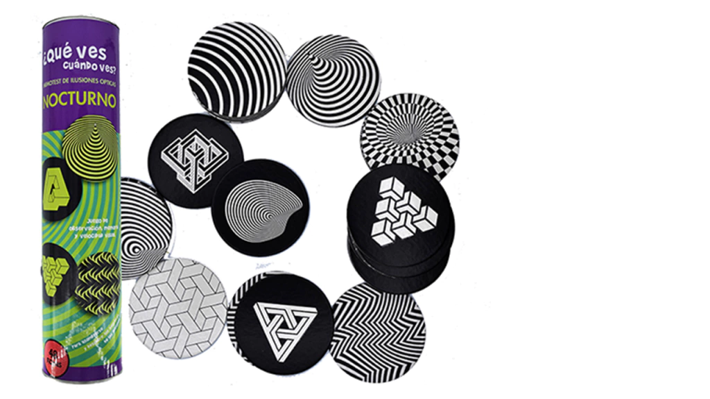 Juego de memoria con ilusiones ópticas Fluorescentes que brillan en la oscuridad . 48 desafíos visuales para descubrir. Un juego para asombrarse con los efectos de las ilusiones ópticas, jugar con la mirada y descubrir porque vemos lo que vemos.