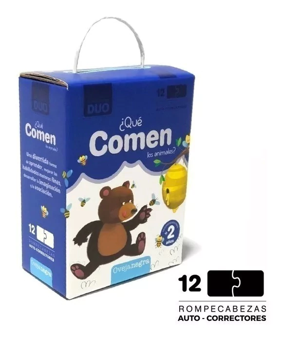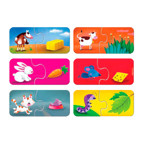 Incluye 12 rompecabezas (ardilla, caballo, conejo, gato, jirafa, oruga, mono, oso, perro, rana, ratón, vaca ).